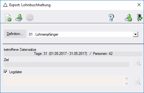 Bevor eine Datenausgabe erfolgen kann, muss im Erfassungsdialog eine Definition angelegt werden. Danach ist die gewünschte Definition auszuwählen. Die Anzahl der Tage und Personen, nach welchen der Export eingeschränkt werden soll, werden hierbei angezeigt.