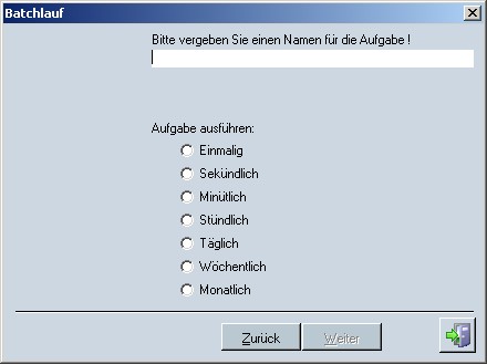 Zeitsteuerung neu anlegenÜber "Neu" wird eine neue Zeitsteuerungsdefinition angelegt. Es wird ein Assistent gestartet und folgende Einstellungen müssen getroffen werden: