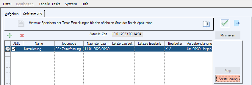 Hier wird der zeitgesteuerte Ablauf der Abarbeitung der Jobs konfiguriert. In der Tabelle werden alle definierten Timer angezeigt.