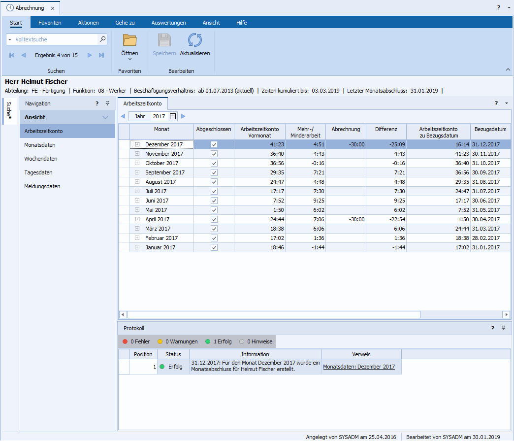Weiterhin wird angegeben, bis zu welchem Datum die Arbeitszeiten des Mitarbeiters bereits kumuliert wurden und wann der letzte Monatsabschluss erfolgt ist. Hinweis: Das Datum "Zeiten kumuliert bis" wird maximal mit "gestern" angegeben, auch wenn bereits eine manuelle Kumulierung bis zum Ende des aktuellen Monats durchgeführt wurde.