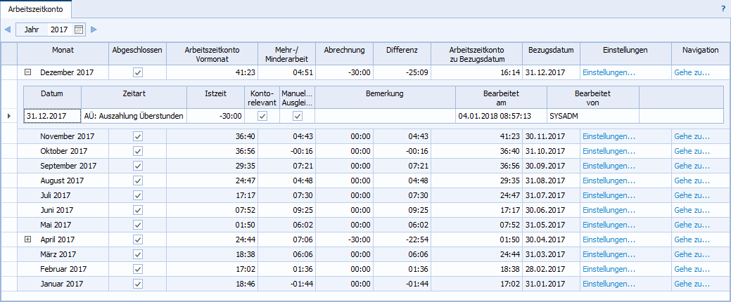 Für jeden Monat können zudem alle Abrechnungssätze, welche automatisch durch die Kumulierung der Monatsdaten oder manuell durch einen Ausgleich des Arbeitszeitkontos erzeugt wurden, in der jeweiligen Untertabelle angezeigt werden.