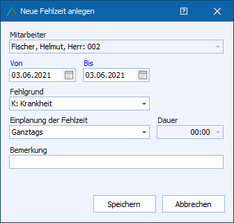 Neue Fehlzeit anlegenÜber den Dialog "Neue Fehlzeit anlegen" wird eine neue Fehlzeit für den ausgewählten Mitarbeiter eingetragen.