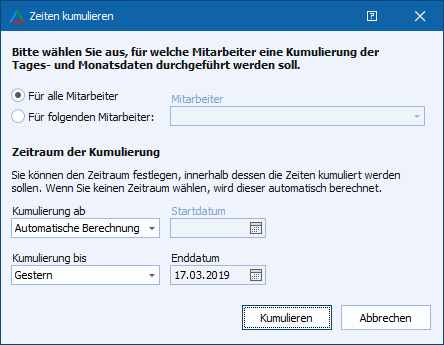 Für die Kumulierung muss zunächst festgelegt werden, ob diese für alle oder nur für einen konkreten Mitarbeiter durchgeführt werden soll. Anschließend wird der Zeitraum der Kumulierung eingegrenzt.