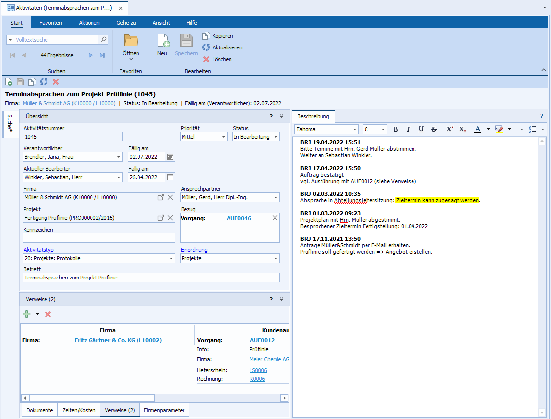 Zusätzlich zum Feld "Bezug" können der Aktivität in der Registerkarte "Verweise" weitere Vorgänge wie bspw. Bestellungen, Angebote oder Aufträge zugeordnet werden. Dabei werden neben der Vorgangs- sowie der Belegnummer zusätzliche Informationen, wie die zum Vorgang gehörende Firma oder das zugehörige Projekt, angezeigt. Die Vorgänge sowie die Zusatzinformationen können über einen Verweis aufgerufen werden.