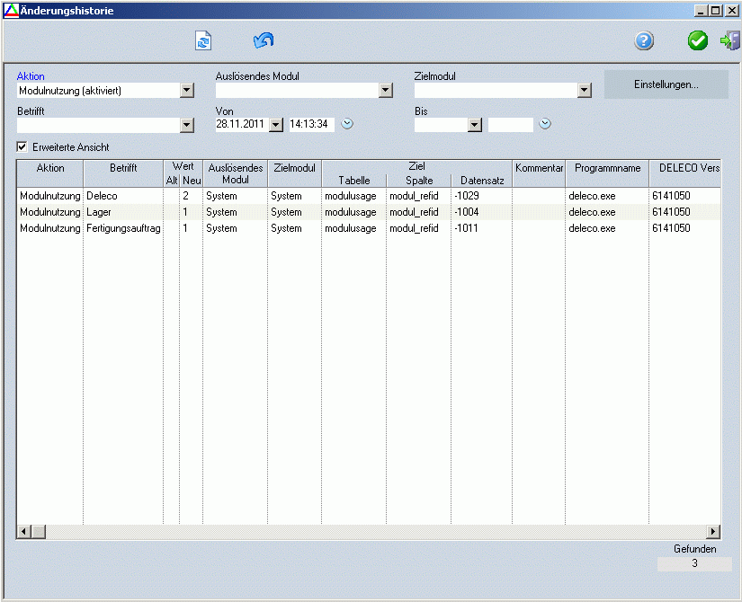 Weiterhin werden in der Tabelle die Bezeichnung der genutzten Exe-Datei, die DELECO-Version sowie der Rechnername des Nutzers angezeigt.