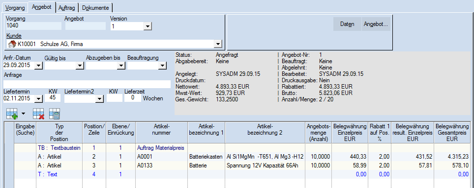 Um ein Angebot erfassen zu können, muss ein Verkaufsvorgang vorhanden sein (siehe Anlegen von Vorgängen).