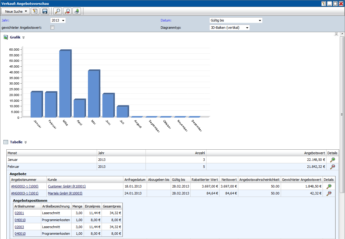 Das Suchergebnis wird sowohl in Tabellenform als auch als Grafik angezeigt. In der Grafik wird der gesamte Angebotswert pro Monat dargestellt.