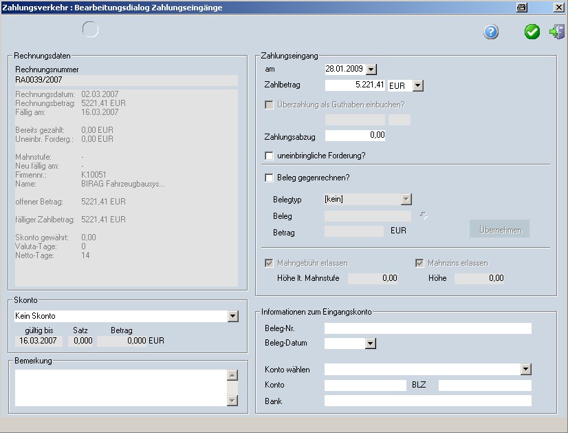 Details zur Rechnung/Gutschrift und damit zum Zahlungseingang werden in der linken Seite des Dialoges angezeigt. Unter anderem auch der fällige Zahlbetrag. Ebenfalls wird dort der offene Mahnbetrag angezeigt. Darunter werden die Skontobedingungen vorgeblendet. Details zur Skontoberechnung