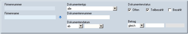 Es existieren verschiedene Suchkriterien: •Firmennummer/-name •Dokumententyp: Auswahl von "alle", "Gutschriften" oder "Rechnungen" •Dokumentennummer: Eingabe der gesamten, oder einen Teil der Rechnungs- bzw. Gutschriftsnummer •Datum des Dokumentes (ab, am, bis) •Status des Dokumentes (Offen, Teilbezahlt) •Belegbetrag (größer, kleiner, gleich, von-bis)