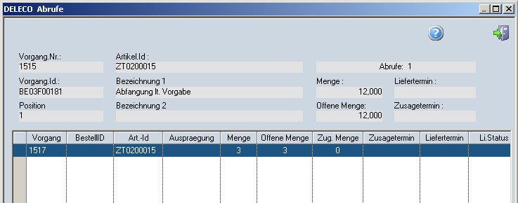 Über das Kontextmenü der rechten Maustaste ist für die einzelnen Positionen in der Rahmenbestellung eine Anzeige der Abrufbestellungen möglich. Dazu muss die Zeile markiert und die Funktion "Abrufe anzeigen" aufgerufen werden. Im oberen Teil wird die Position der Rahmenbestellung angezeigt. Die Tabelle zeigt die dazugehörigen Positionen der Abrufbestellungen und ihren Status.