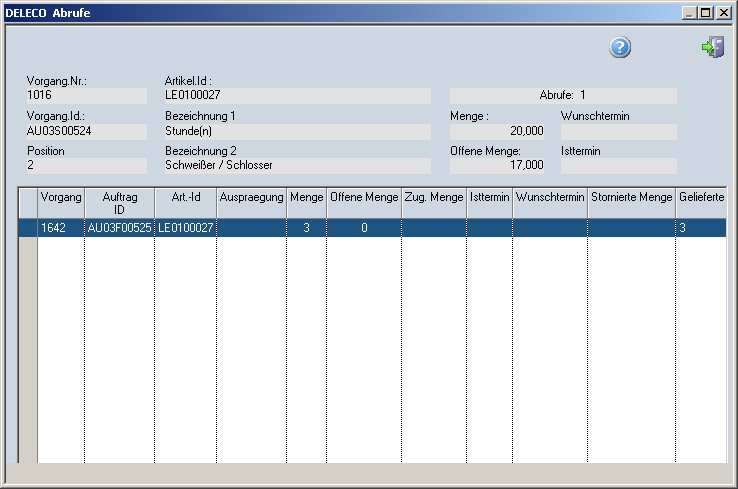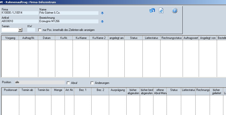 Wird nur mit der Einschränkung nach einer Firma gesucht und aktualisiert, werden alle zu dieser Firma existierenden Rahmenaufträge in der oberen Vorgangstabelle angezeigt. Wird einer oder werden mehrere Aufträge markiert, so werden die Positionen in die untere Positionstabelle geladen. Wurde zusätzlich nach einem Artikel eingeschränkt, sind nur die Positionen dieses Artikels sichtbar.
