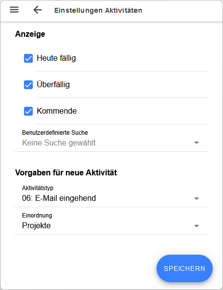 Auf der Seite "Einstellungen Aktivitäten" legen Sie den Umfang der anzuzeigenden Aktivitäten im Bereich "Aktivitäten" fest. Über das jeweilige Auswahlfeld wählen Sie aus, ob Aktivitäten im Status "Heute fällig", "Überfällig" und "Kommende" aufgelistet werden sollen. Zudem können Sie eine benutzerdefinierte Suche auswählen, die als zusätzliche Kategorie auf der Seite "Aktivität auswählen" angezeigt wird. Zur Auswahl stehen dabei Ihre gespeicherten Suchen aus dem DELECO Modul "Aktivitäten".
