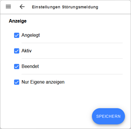 Auf der Seite "Einstellungen Störungsmeldung" legen Sie den Umfang der anzuzeigenden Störungsmeldungen im Bereich "Störungsmeldung" fest. Über das jeweilige Auswahlfeld wählen Sie aus, ob Störungsmeldungen im Status "Angelegt", "Aktiv" und "Beendet" aufgelistet werden sollen. Zudem können Sie einstellen, dass nur von Ihnen erstellte Störungsmeldungen angezeigt werden sollen.