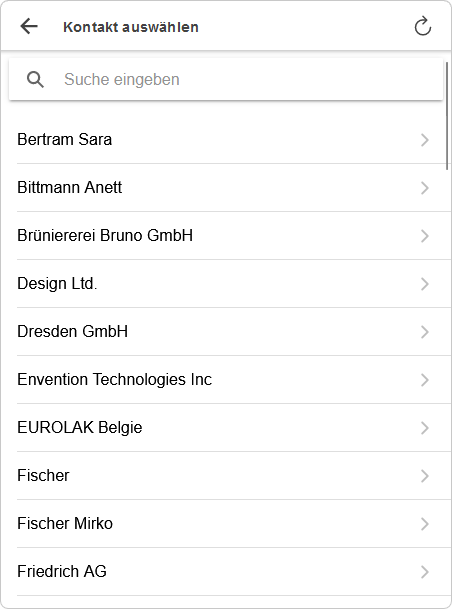 Auf der Seite "Kontakt auswählen" werden alle Firmen, Ansprechpartner und Anschriften aus dem Modul "Firma" aufgelistet. Mit Auswahl eines Kontakts öffnen Sie diesen auf der Seite "Kontakt - Detail".