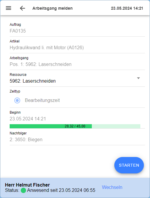 Wählen Sie nach Auswahl eines Arbeitsgangs "Starten", um die Ausführung des Arbeitsgangs und somit eine Meldung zu beginnen. Als Beginn wird die aktuelle Zeit automatisch eingetragen.