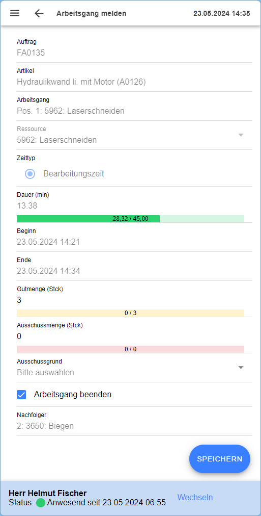 Zusätzlich können Sie eine Gutmenge und eine Ausschussmenge sowie einen Ausschussgrund angeben, den Arbeitsgang über das gleichnamige Auswahlfeld beenden und eine Bemerkung zur Meldung eingeben. Bereits gemeldete Zeiten und Mengen sowie die Sollzeit und -menge des Arbeitsgangs können Sie anhand der Fortschrittsanzeigen an den jeweiligen Feldern erkennen.