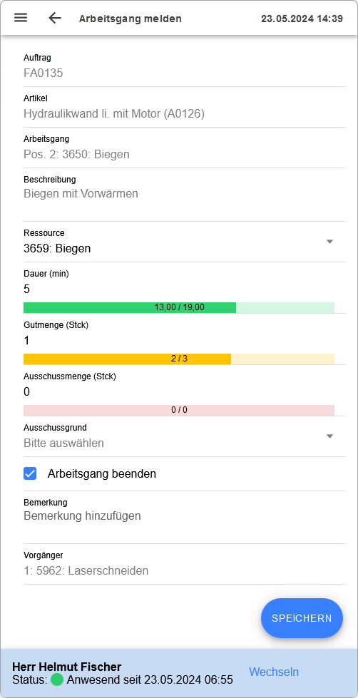 Arbeitsgang meldenUm eine Dauermeldung zu einem Arbeitsgang zu erfassen, geben Sie im Feld "Dauer" die Zeit ein, die Sie auf den Arbeitsgang melden wollen. Zusätzlich können Sie eine Gutmenge und eine Ausschussmenge sowie einen Ausschussgrund angeben, den Arbeitsgang über das gleichnamige Auswahlfeld beenden und eine Bemerkung zur Meldung eingeben. Bereits gemeldete Zeiten und Mengen sowie die Sollzeit und -menge des Arbeitsgangs können Sie anhand der Fortschrittsanzeigen an den jeweiligen Feldern erkennen. Wählen Sie "Speichern", um die Meldung mit den eingegebenen Daten zu speichern.