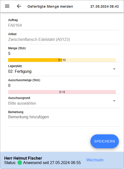 Auf der Seite "Gefertigte Menge melden" erfassen Sie die gefertigte Menge für den ausgewählten Fertigungsauftrag. Geben Sie dazu im Feld "Menge" die gefertigte Menge des Fertigungsartikels ein, die Sie für den Fertigungsauftrag melden wollen. Bereits gemeldete Mengen sowie die Sollmenge des Fertigungsauftrags können Sie anhand der Fortschrittsanzeige am Feld "Menge" erkennen. Wählen Sie "Speichern", um die Meldung mit den eingegebenen Daten zu speichern.