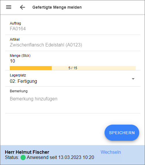 Auf der Seite "Gefertigte Menge melden" erfassen Sie die gefertigte Menge für den ausgewählten Fertigungsauftrag. Geben Sie dazu im Feld "Menge" die gefertigte Menge des Fertigungsartikels ein, die Sie für den Fertigungsauftrag melden wollen. Bereits gemeldete Mengen sowie die Sollmenge des Fertigungsauftrags können Sie anhand der Fortschrittsanzeige am Feld "Menge" erkennen. Wählen Sie "Speichern", um die Meldung mit den eingegebenen Daten zu speichern.