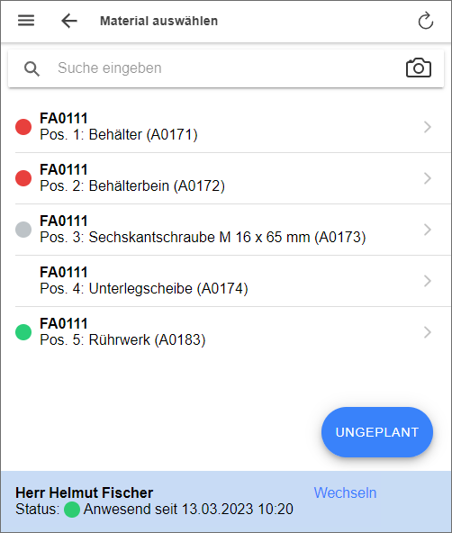 Über das Suchfeld können Sie entweder den Barcode einer Materialposition scannen oder die in der Liste angezeigten Positionen durch Eingabe eines Suchbegriffes weiter einschränken. Ist das Suchergebnis eindeutig oder wurde eine Materialposition gescannt, wird anschließend automatisch zur Seite "Material melden" gewechselt.