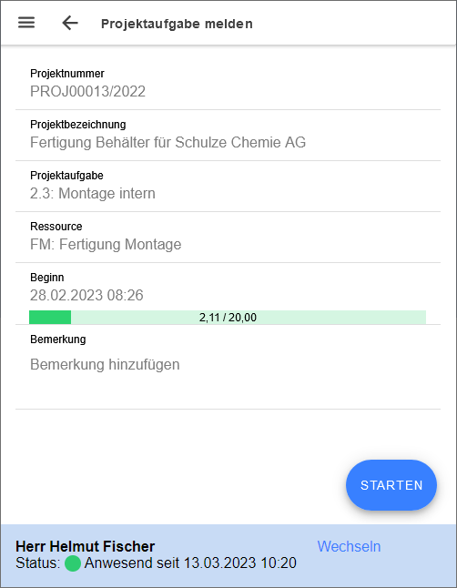 Projektaufgabe beginnenWählen Sie nach Auswahl einer Projektaufgabe "Starten", um eine Meldung zu beginnen. Als Beginn wird die aktuelle Zeit automatisch eingetragen. Zusätzlich können Sie eine Bemerkung zur Meldung eingeben.