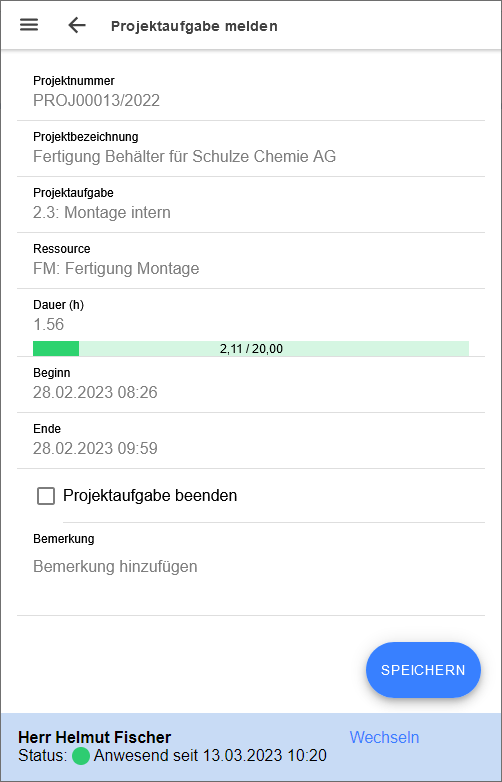 Projektaufgabe beendenZum Beenden einer offenen Projektmeldung wählen Sie die Projektaufgabe erneut auf der Seite "Projektaufgabe auswählen" aus. Als Ende wird automatisch die aktuelle Zeit eingetragen. Über die Differenz zwischen Ende und Beginn wird somit die Dauer der Projektaufgabe ermittelt. Zusätzlich können Sie die Projektaufgabe über das gleichnamige Auswahlfeld beenden und eine Bemerkung zur Meldung eingeben. Wählen Sie "Speichern", um die Meldung mit den eingegebenen Daten zu speichern.