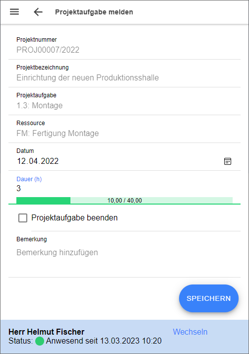 Um eine Dauermeldung zu einer Projektaufgabe zu erfassen, geben Sie im Feld "Dauer" die Zeit in Stunden ein, die Sie auf die Aufgabe melden wollen. Zusätzlich können Sie das Datum der Meldung anpassen, die Projektaufgabe über das gleichnamige Auswahlfeld beenden und eine Bemerkung zur Meldung eingeben. Bereits gemeldete Zeiten für die Projektaufgabe können Sie anhand der Fortschrittsanzeige am Feld "Dauer" erkennen. Wählen Sie "Speichern", um die Meldung mit den eingegebenen Daten zu speichern.