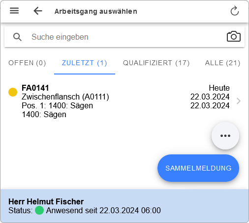 Hinweis: Es werden nur meldbare Arbeitsgänge angezeigt. D.h. der Arbeitsgang sowie der zugehörige Fertigungsauftrag muss im Status "Freigegeben" oder "In Arbeit" sein und der Vorgängerarbeitsgang muss im Status "Fertig" sein.