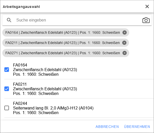 3. Arbeitsgänge auswählenWählen Sie alle Arbeitsgänge aus, die mit der Sammelmeldung erfasst werden sollen. Der Dialog "Arbeitsgangauswahl" öffnet sich automatisch nachdem Sie eine Ressource ausgewählt haben. Über das Suchfeld können Sie ebenfalls entweder die Barcodes der Arbeitsgänge scannen oder die in der Liste angezeigten Arbeitsgänge durch Eingabe eines Suchbegriffes weiter einschränken. Mithilfe der Schaltfläche "Übernehmen" werden die ausgewählten Arbeitsgänge in die Sammelmeldung übernommen.