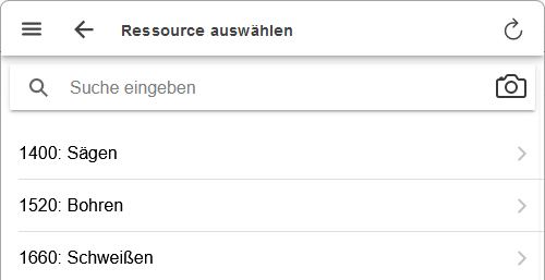 2. Ressource auswählenWählen Sie die Ressource aus, auf der die gleichartigen Arbeitsgänge ausgeführt werden. Die Seite "Ressource auswählen" öffnet sich automatisch, sobald Sie die Schaltfläche "Sammelmeldung" auf der Seite "Arbeitsgang auswählen" gewählt haben. Über das Suchfeld können Sie entweder den Barcode einer Ressource scannen oder die in der Liste angezeigten Ressourcen durch Eingabe eines Suchbegriffes weiter einschränken. Ist das Suchergebnis eindeutig oder wurde eine Ressource gescannt, wird diese automatisch übernommen.