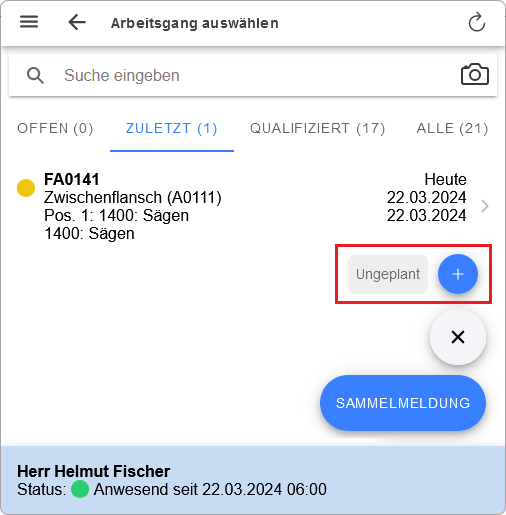 Neben den Arbeitsgängen aus dem Arbeitsplan eines Fertigungsauftrags können Sie zusätzlich ungeplante Arbeitsgänge aus Arbeitsgangschablonen melden. Dieser ungeplante Arbeitsgang wird mit dem Speichern dem Arbeitsplan des ausgewählten Fertigungsauftrags hinzugefügt.
