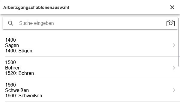 3. Arbeitsgangschablone auswählenWählen Sie eine Arbeitsgangschablone für den ungeplanten Arbeitsgang aus. Der Dialog "Arbeitsgangschablonenauswahl" öffnet sich automatisch nachdem Sie einen Fertigungsauftrag ausgewählt haben. Über das Suchfeld können Sie ebenfalls entweder den Barcode einer Arbeitsgangschablone scannen oder die in der Liste angezeigten Arbeitsgangschablonen durch Eingabe eines Suchbegriffes weiter einschränken. Der ungeplante Arbeitsgang wird anschließend aus den Vorgaben der Arbeitsgangschablone erstellt.