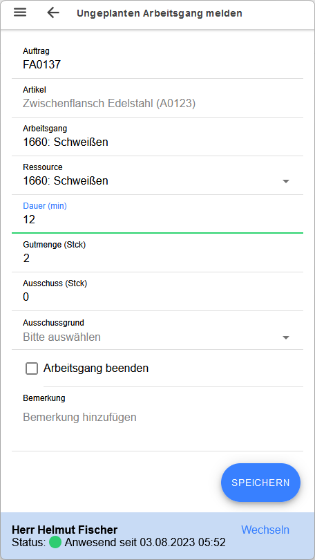 Abb.: Dauermeldung für einen ungeplanten Arbeitsgang erfassen