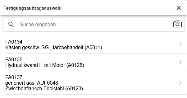 2. Fertigungsauftrag auswählenWählen Sie den Fertigungsauftrag aus, zu dem ein ungeplanter Arbeitsgang gemeldet werden soll. Der Dialog "Fertigungsauftragsauswahl" öffnet sich automatisch, sobald Sie die Schaltfläche "Ungeplant" auf der Seite "Arbeitsgang auswählen" gewählt haben. Über das Suchfeld können Sie entweder den Barcode eines Fertigungsauftrags scannen oder die in der Liste angezeigten Fertigungsaufträge durch Eingabe eines Suchbegriffes weiter einschränken. Ist das Suchergebnis eindeutig oder wurde ein Fertigungsauftrag gescannt, wird dieser automatisch in das Feld "Auftrag" übernommen.