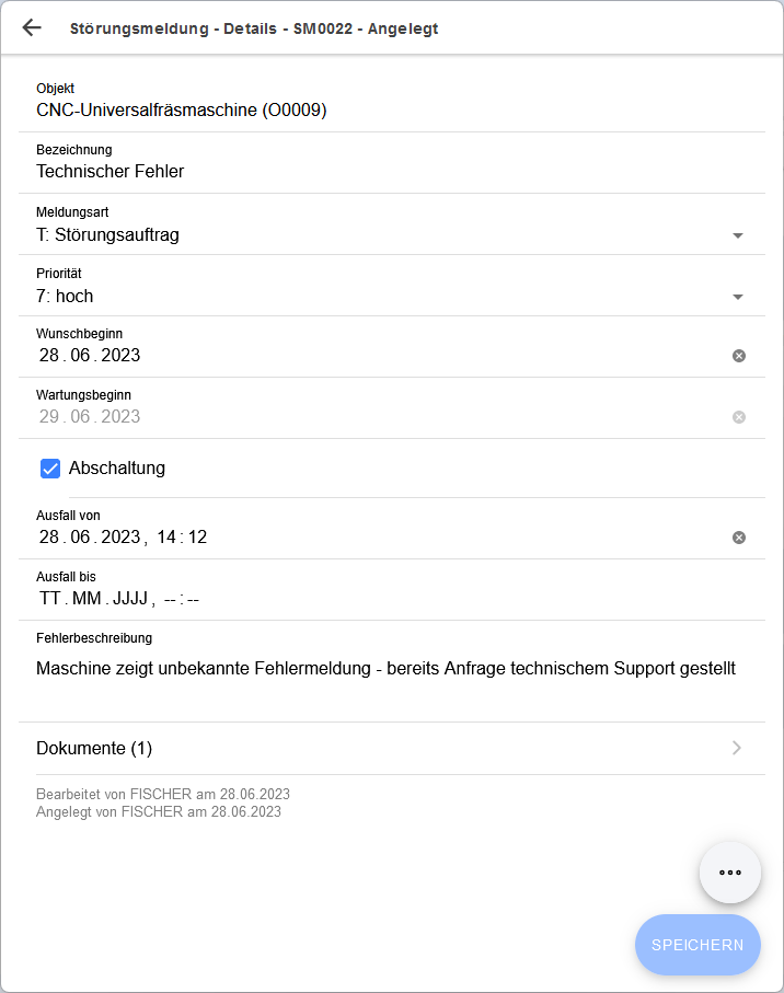 Zudem werden folgende Informationen zu einer Störungsmeldung angezeigt: