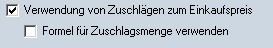 Berechnung der Zuschlagsmenge: Wird keine Formel verwendet, ist die Zuschlagsmenge gleich der Einkaufsmenge umgerechnet in die Lagereinheit. Wird eine Formel verwendet, wird die Einkaufsmenge in die Menge in Lagereinheit umgerechnet und dann entsprechend der Formel die Zuschlagsmenge ermittelt.
