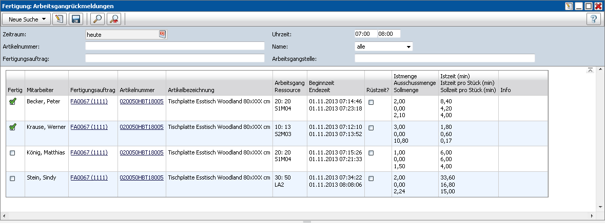 Nachtschicht: Soll nach den Arbeitsgängen von Nachtschichten gesucht werden, muss bei der Uhrzeit bspw. nach 22-6 Uhr eingeschränkt werden um Ergebnisse der kompletten Schicht zu erhalten. Wird keine Uhrzeit angegeben, wird pro Tag lediglich bis 23:59:59 gesucht.