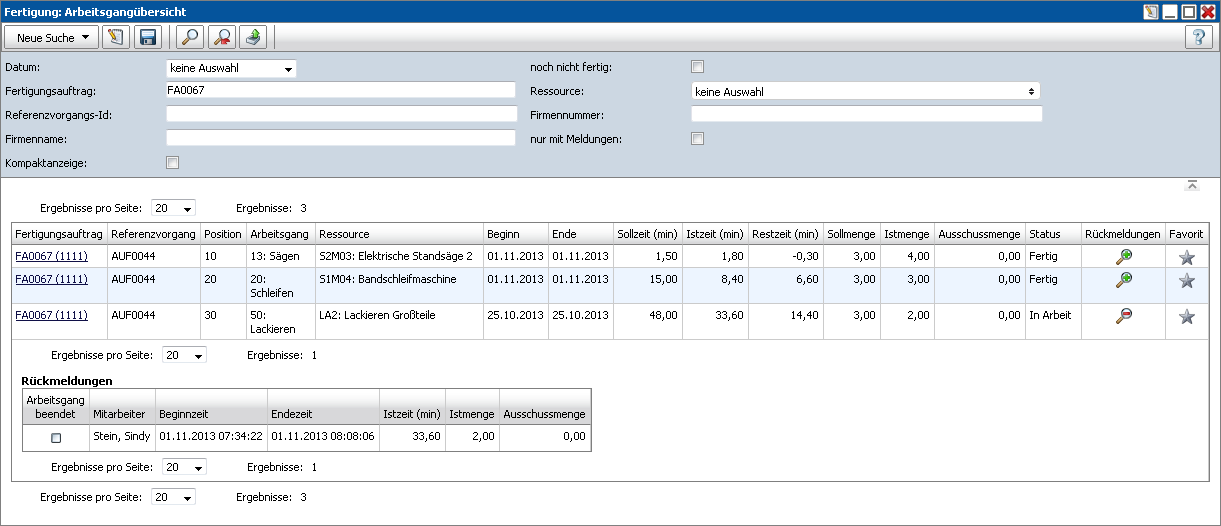 Anzeige der Rückmeldungen zum Arbeitsgang