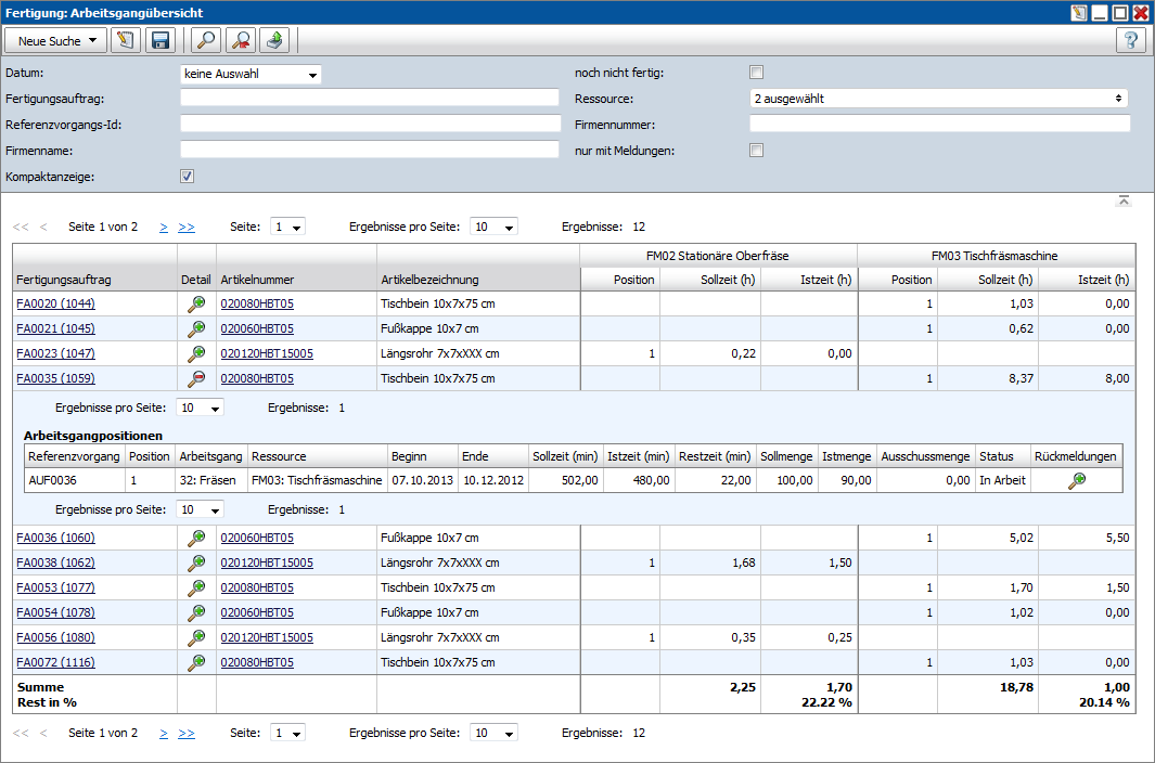 Arbeitsgangpositionen sowie deren summierte Soll- und Istzeit