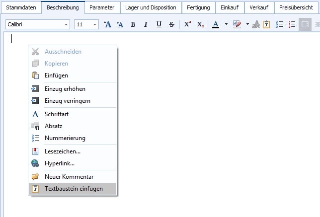 Es können Textbausteine vordefiniert werden, welche in die Artikelbeschreibung übernommen werden können. Dies erfolgt über die Symbolleiste des Fensters "Beschreibung" - Schaltfläche "Textbaustein einfügen" oder über das Kontextmenü.