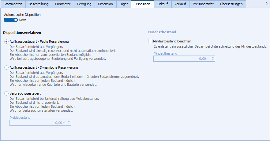 Ist diese Einstellung nicht aktiviert, erfolgt keine automatische Disposition des Artikels und alle weiteren Einstellungen auf dieser Registerkarte sind deaktiviert.