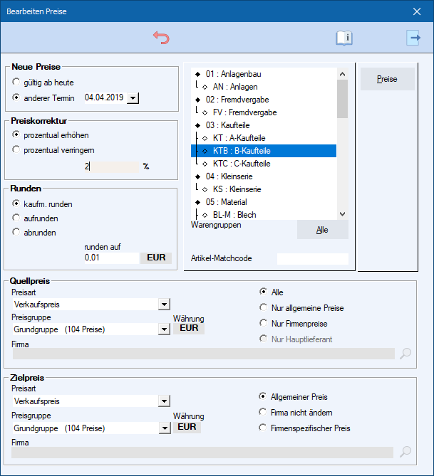 Preise eines Artikels aus einer Quellpreisgruppe werden nach den angegebenen Kriterien neu berechnet und in eine Zielpreisgruppe aufgenommen. Eventuelle Währungsumrechnungen erfolgen nach dem gültigen Währungskurs.