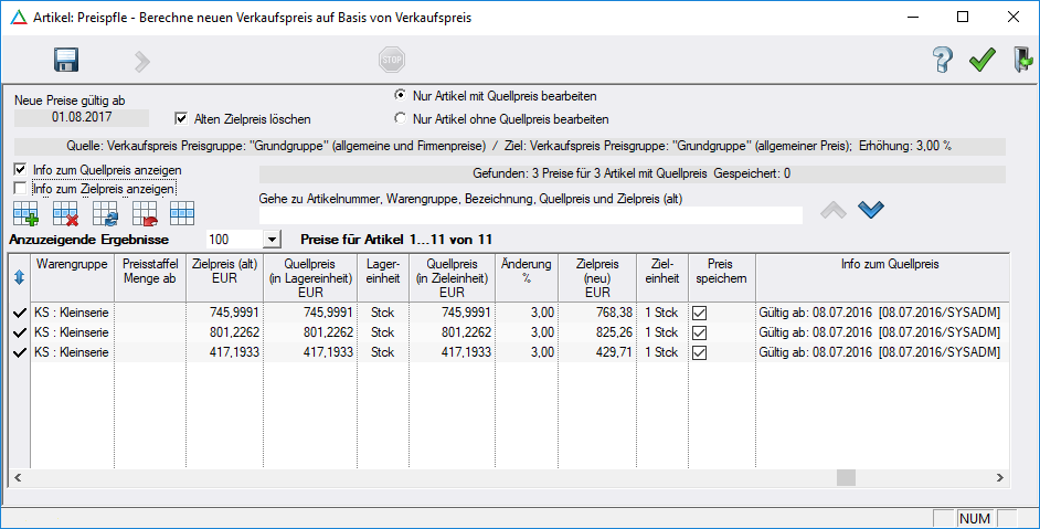 Es werden je nach Option nur Artikel mit bzw. ohne gültigen Quellpreis in der Tabelle angezeigt.