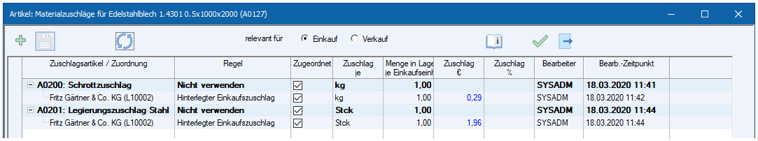 Zuordnung eines Zuschlagsartikels zu einem Basisartikel (bezuschlagter Artikel)Artikeln, welche mit Materialzuschlägen eingekauft bzw. verkauft werden sollen, müssen die jeweiligen Zuschlagsartikel zugeordnet werden. Diese werden später automatisch oder manuell als untergeordnete Positionen in die Vorgänge eingefügt. Die Zuordnung erfolgt im Dialog "Materialzuschläge" getrennt für Einkauf und Verkauf.