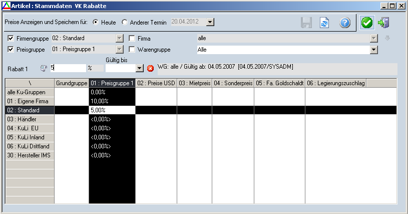 Über die jeweiligen Auswahlfelder können die Firmen-, Waren- sowie Preisgruppen in der Tabelle angezeigt werden. Wird eine der Kombinationen ausgewählt, so kann der Rabatt ins Rabattfeld eingetragen werden. Mit ENTER kann durch die Tabelle navigiert werden. Änderungen werden dabei automatisch gespeichert.