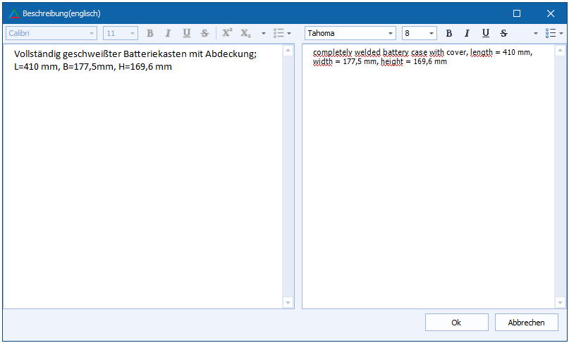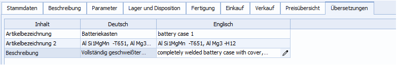 Die Felder Artikelbezeichnung und Artikelbezeichnung 2 können direkt übersetzt werden.
