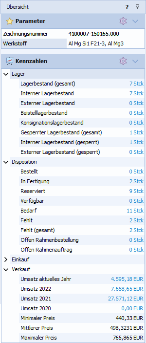 Die Menge "In Fertigung" enthält alle zu fertigenden Mengen des Artikels aus Fertigungsaufträgen, für die noch kein Lagerzugang erfolgt ist. Beachtet werden dabei Fertigungsaufträge im Status "Bestätigt", "Freigegeben" und "In Arbeit".