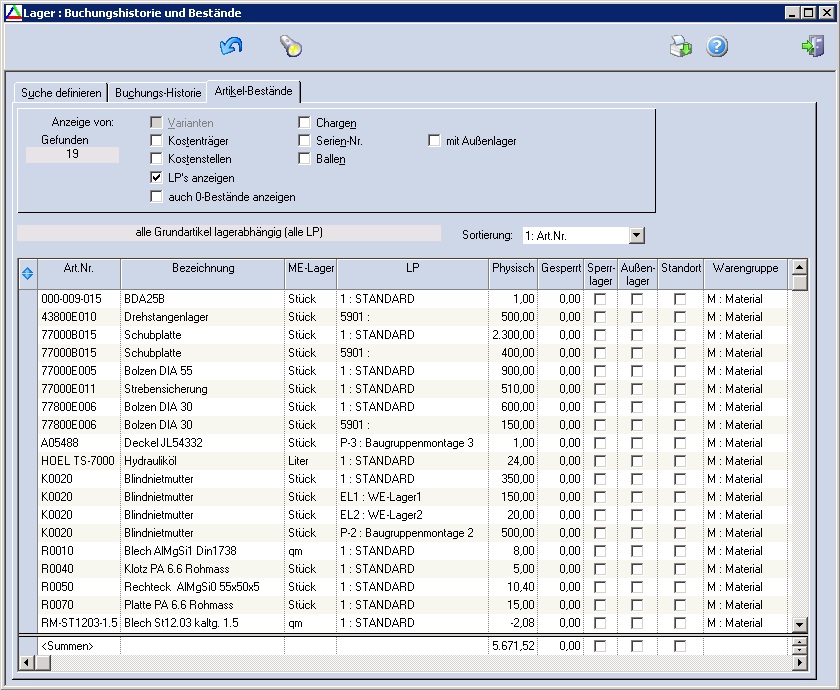 Ist das Optionsfeld "LP’s anzeigen" aktiv, werden die Gesamtbestände pro Artikel und pro Lagerplatz angezeigt.