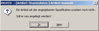 Wird bei der Suche ein Artikel vollständig spezifiziert (d.h. alle vorhandenen Werte sind angegeben) und es wird kein passender Artikel gefunden, dann kann (mit Abfrage) sofort dieser Artikel angelegt und im Suchdialog ausgewählt werden. Für eine eventuelle weitere Bearbeitung des Artikels muss dieser dann jedoch im Artikelstamm geöffnet werden.