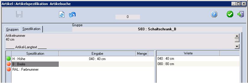 grün: Alle Werte sind erfasst. rot: Es fehlen noch Eingaben. gelb: Der existierende Artikel fehlt noch, aber dieser ist vollständig spezifiziert, so dass er ggf. generiert werden kann.